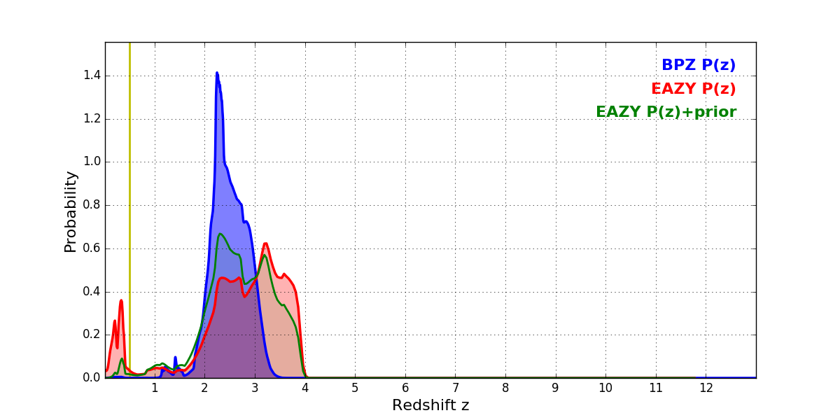 In P(z) plots: Yellow lines mark the cluster redshift z = 0.505,