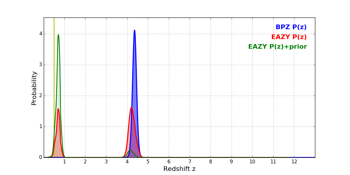 In P(z) plots: Yellow lines mark the cluster redshift z = 0.505,