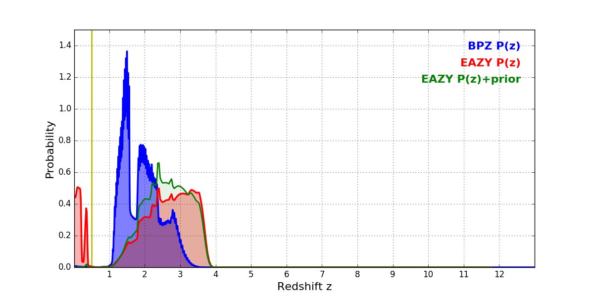 In P(z) plots: Yellow lines mark the cluster redshift z = 0.505,