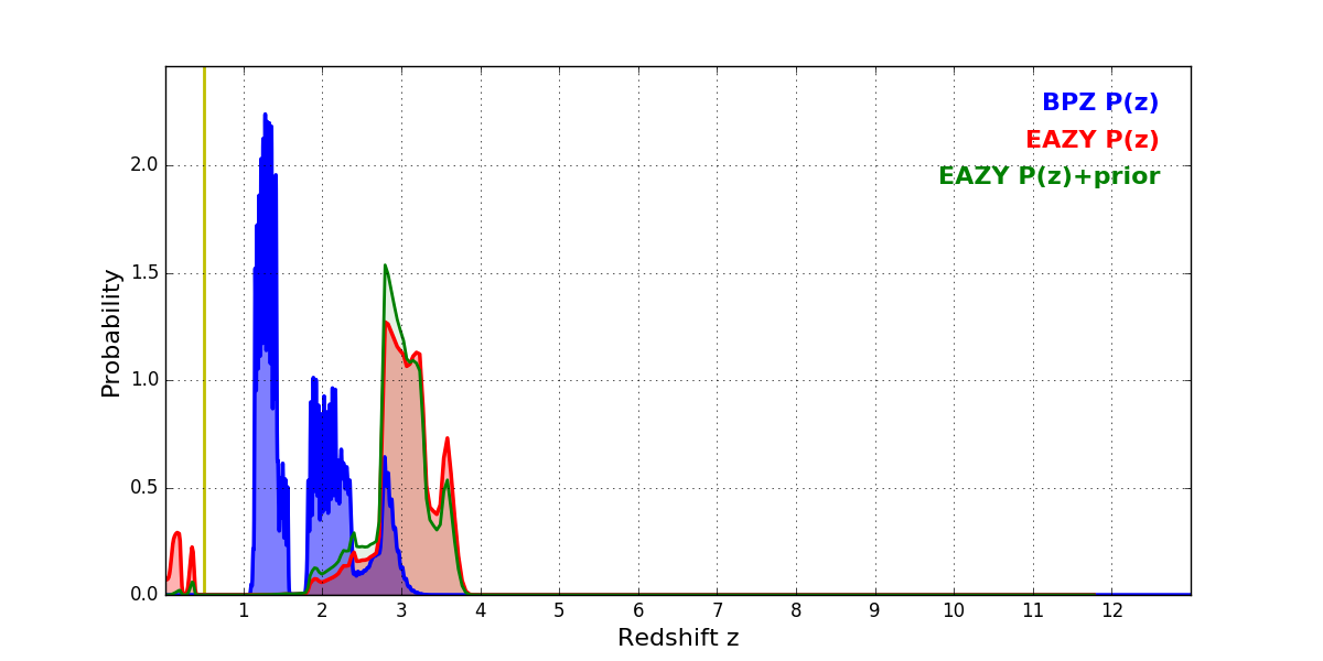 In P(z) plots: Yellow lines mark the cluster redshift z = 0.505,