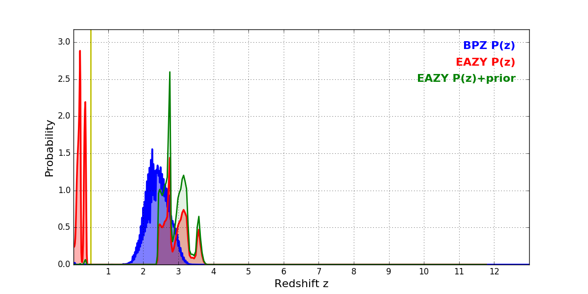In P(z) plots: Yellow lines mark the cluster redshift z = 0.505,