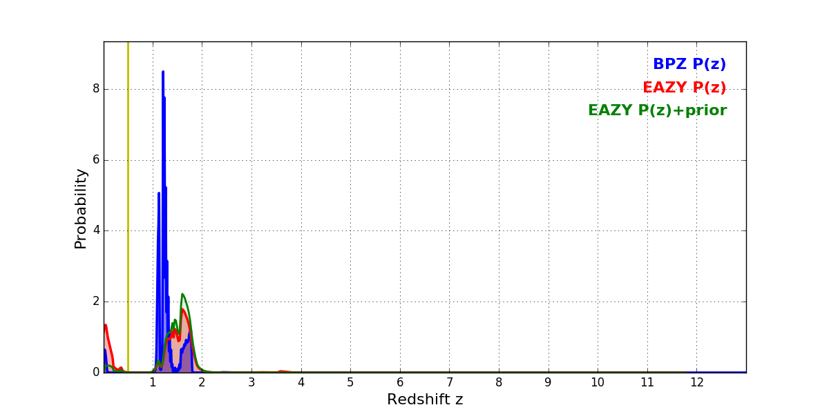 In P(z) plots: Yellow lines mark the cluster redshift z = 0.505,