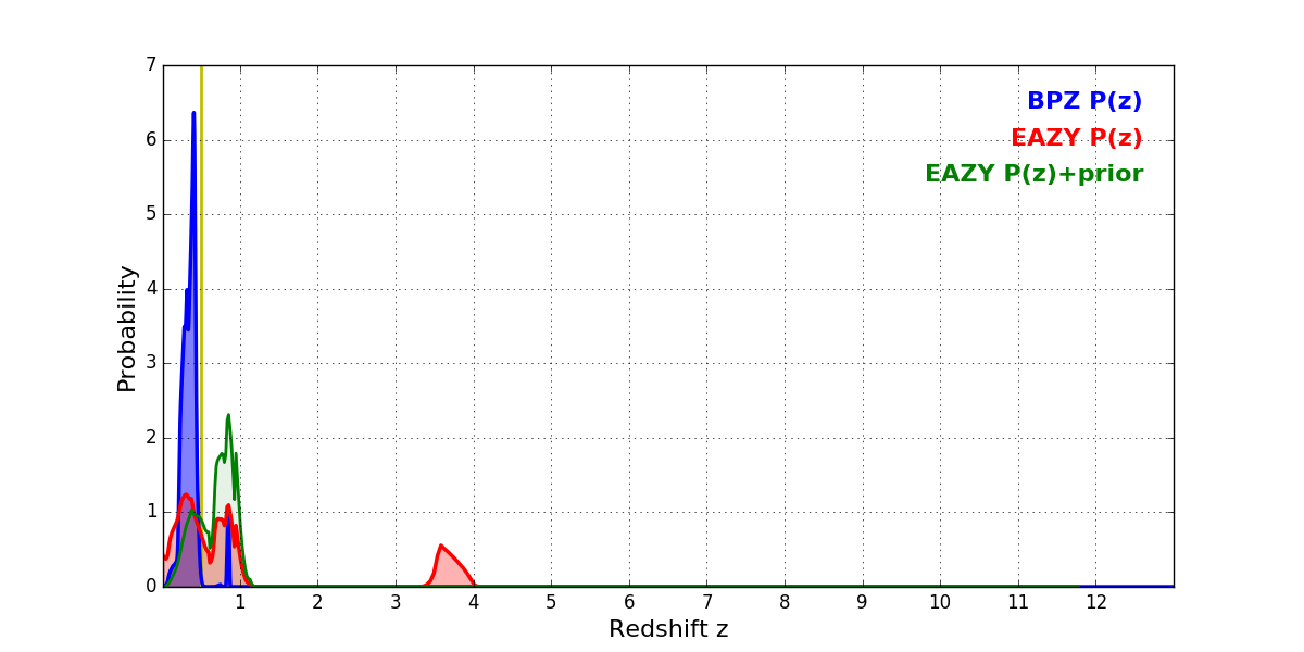 In P(z) plots: Yellow lines mark the cluster redshift z = 0.505,