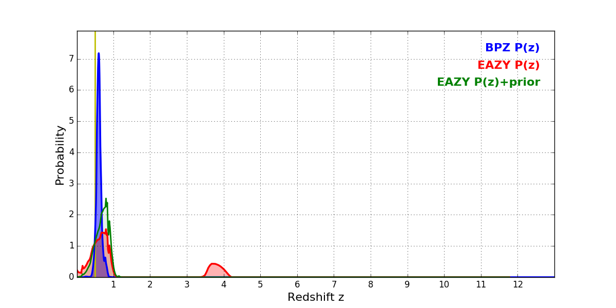 In P(z) plots: Yellow lines mark the cluster redshift z = 0.505,