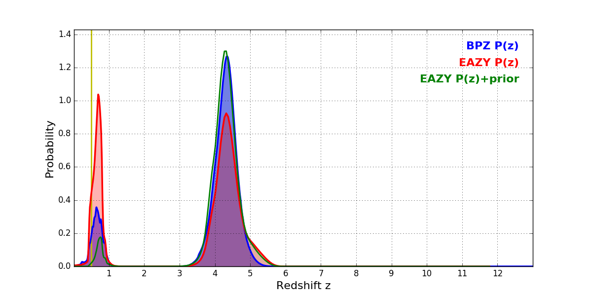 In P(z) plots: Yellow lines mark the cluster redshift z = 0.505,