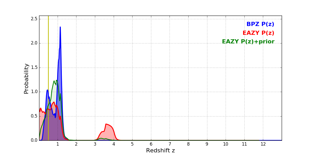 In P(z) plots: Yellow lines mark the cluster redshift z = 0.505,