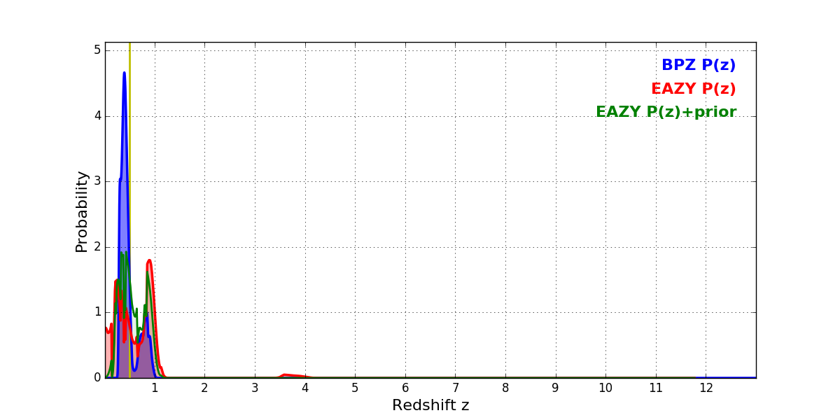 In P(z) plots: Yellow lines mark the cluster redshift z = 0.505,