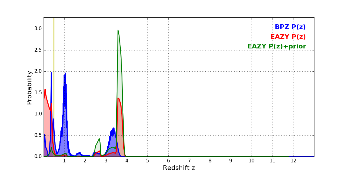 In P(z) plots: Yellow lines mark the cluster redshift z = 0.505,