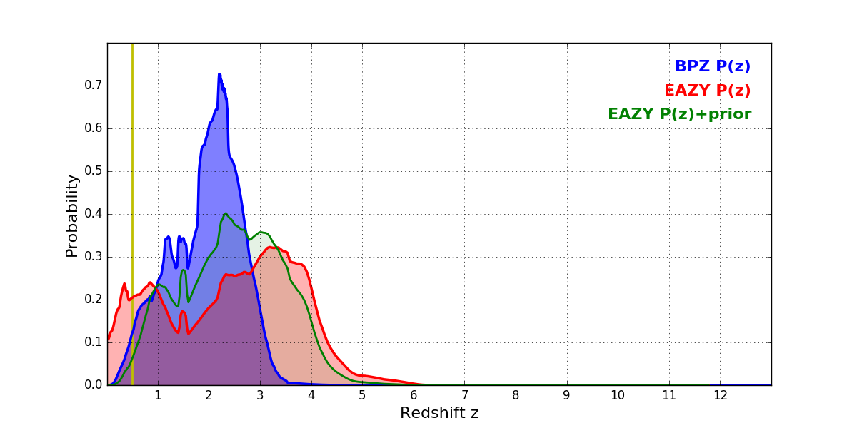 In P(z) plots: Yellow lines mark the cluster redshift z = 0.505,