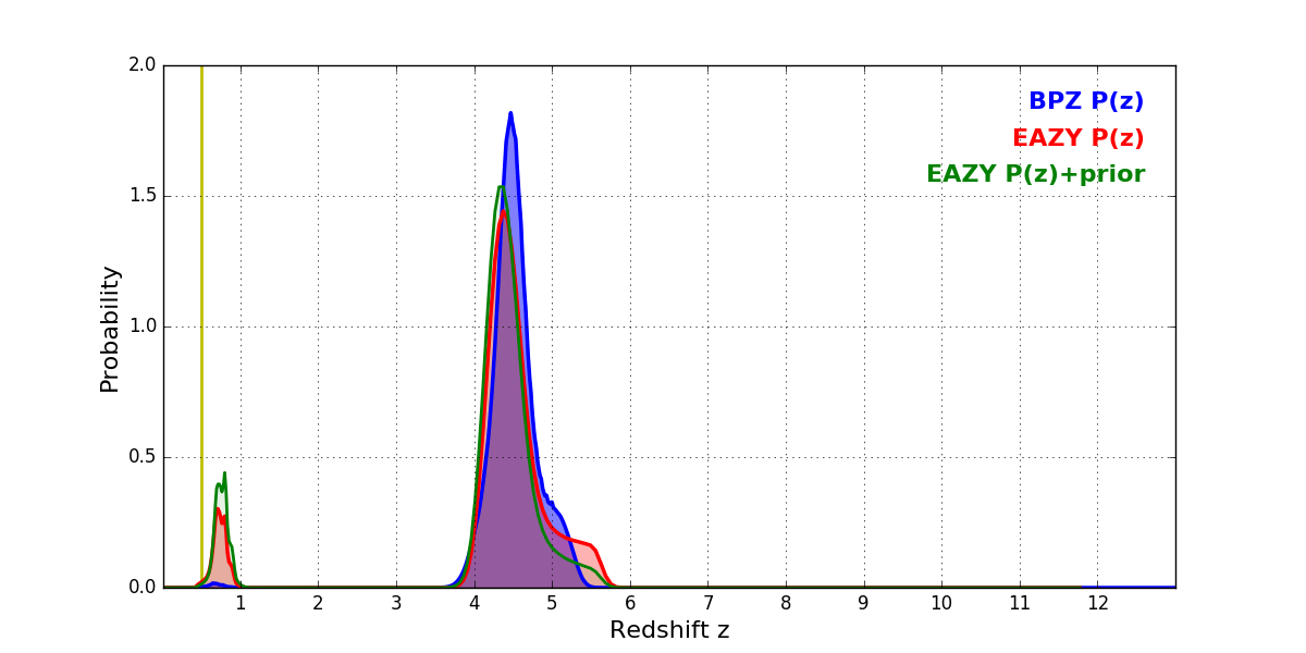 In P(z) plots: Yellow lines mark the cluster redshift z = 0.505,