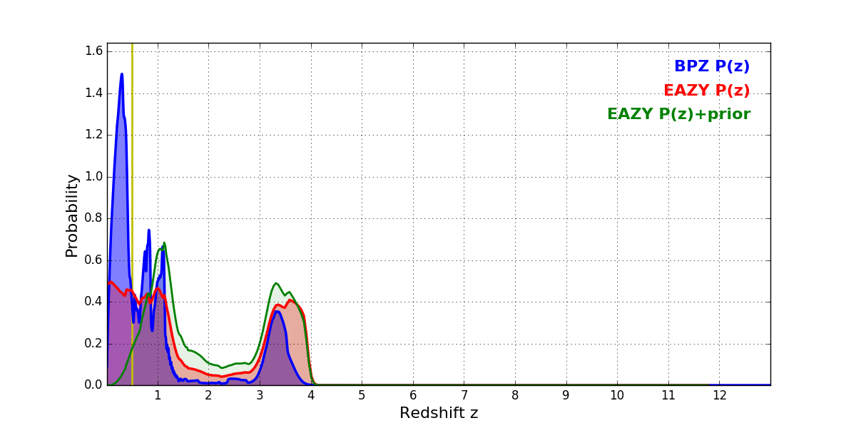 In P(z) plots: Yellow lines mark the cluster redshift z = 0.505,