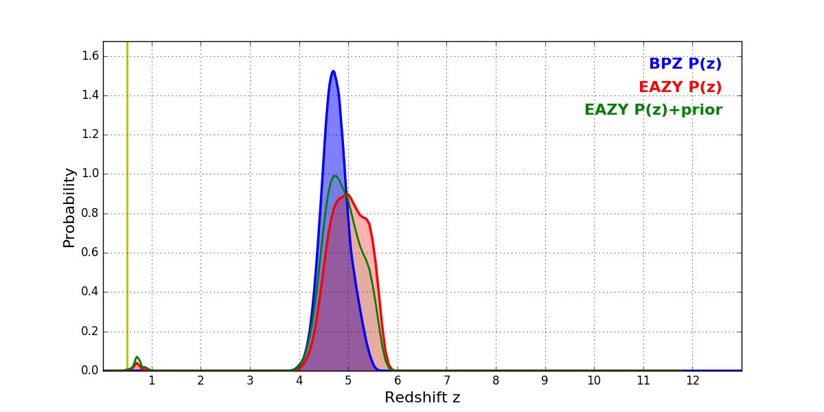 In P(z) plots: Yellow lines mark the cluster redshift z = 0.505,