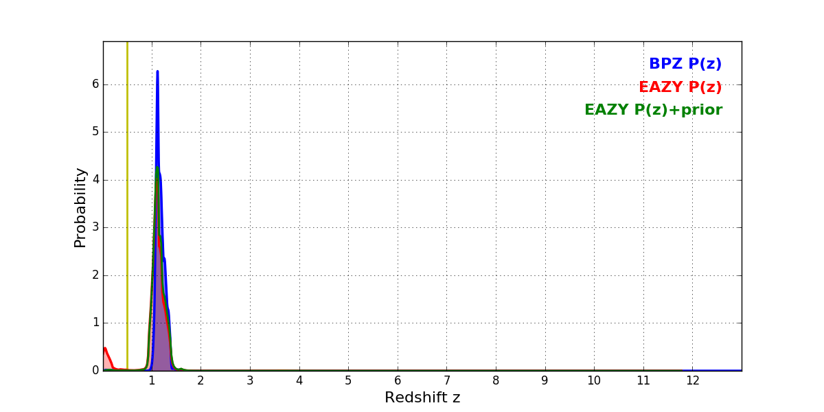In P(z) plots: Yellow lines mark the cluster redshift z = 0.505,