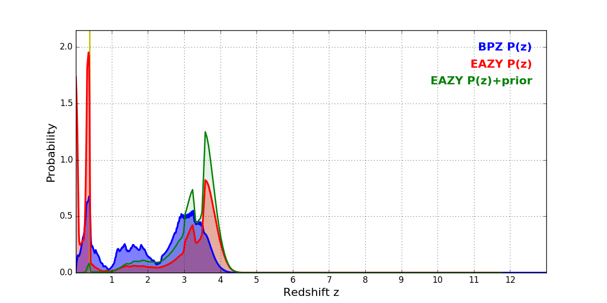 In P(z) plots: Yellow lines mark the cluster redshift z = 0.383,
