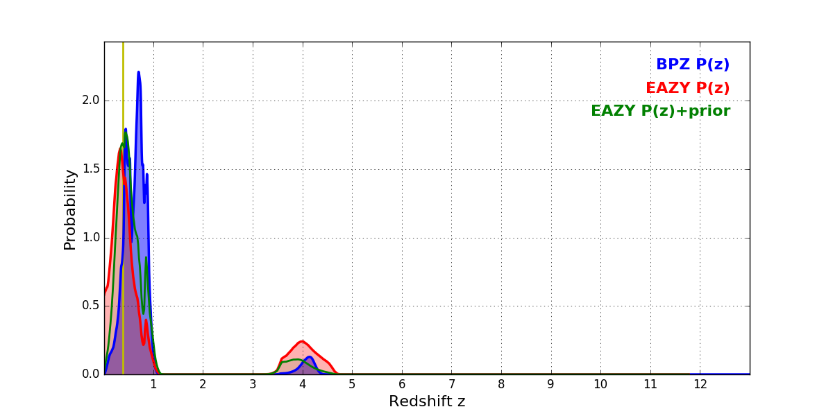 In P(z) plots: Yellow lines mark the cluster redshift z = 0.383,