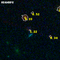 Object #1064 x,y = (3079, 1230) RA, Dec = (09:49:48.672, 17:05:59.28) = (147.45280, 17.09980) BPZ = 1.224 [0.172--3.215] type = 9.30 (SB2_B10 - SB3_B10) chisq2 = 0.45 ODDS = 0.15 z_cluster = 0.383