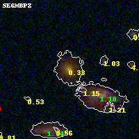 Object #125 x,y = (2606, 3189) RA, Dec = (09:49:50.664, 17:07:56.64) = (147.46110, 17.13240) BPZ = 0.332 [0.258--0.370] type = 3.40 (Ell5_A_0 - Ell4_A_0) chisq2 = 0.08 ODDS = 0.92 z_cluster = 0.383