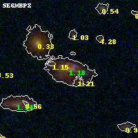 Object #127 x,y = (2651, 3151) RA, Dec = (09:49:50.472, 17:07:54.48) = (147.46030, 17.13180) BPZ = 1.180 [1.139--1.266] type = 7.90 (SB1_B10 - Scd_B10) chisq2 = 0.08 ODDS = 0.98 z_cluster = 0.383
