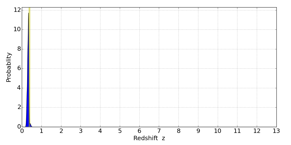 In P(z) plots: Yellow lines mark the cluster redshift z = 0.383,