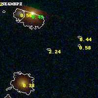 Object #28 x,y = (2329, 3563) RA, Dec = (09:49:51.816, 17:08:18.96) = (147.46590, 17.13860) BPZ = 2.243 [1.191--3.084] type = 9.50 (SB3_B10 - SB2_B10) chisq2 = 0.47 ODDS = 0.24 z_cluster = 0.383