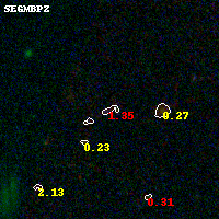 Object #45 x,y = (1721, 3488) RA, Dec = (09:49:54.360, 17:08:14.64) = (147.47650, 17.13740) BPZ = 1.355 [1.051--1.906] type = 8.80 (SB2_B10 - SB1_B10) chisq2 = 1.12 ODDS = 0.35 z_cluster = 0.383