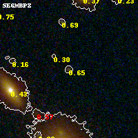 Object #573 x,y = (1407, 2330) RA, Dec = (09:49:55.680, 17:07:05.16) = (147.48200, 17.11810) BPZ = 0.648 [0.304--4.156] type = 8.50 (SB2_B10 - SB1_B10) chisq2 = 0.84 ODDS = 0.26 z_cluster = 0.383