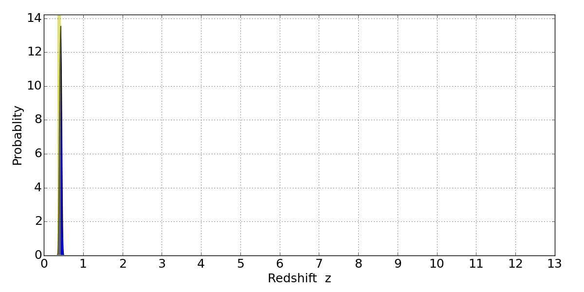 In P(z) plots: Yellow lines mark the cluster redshift z = 0.383,