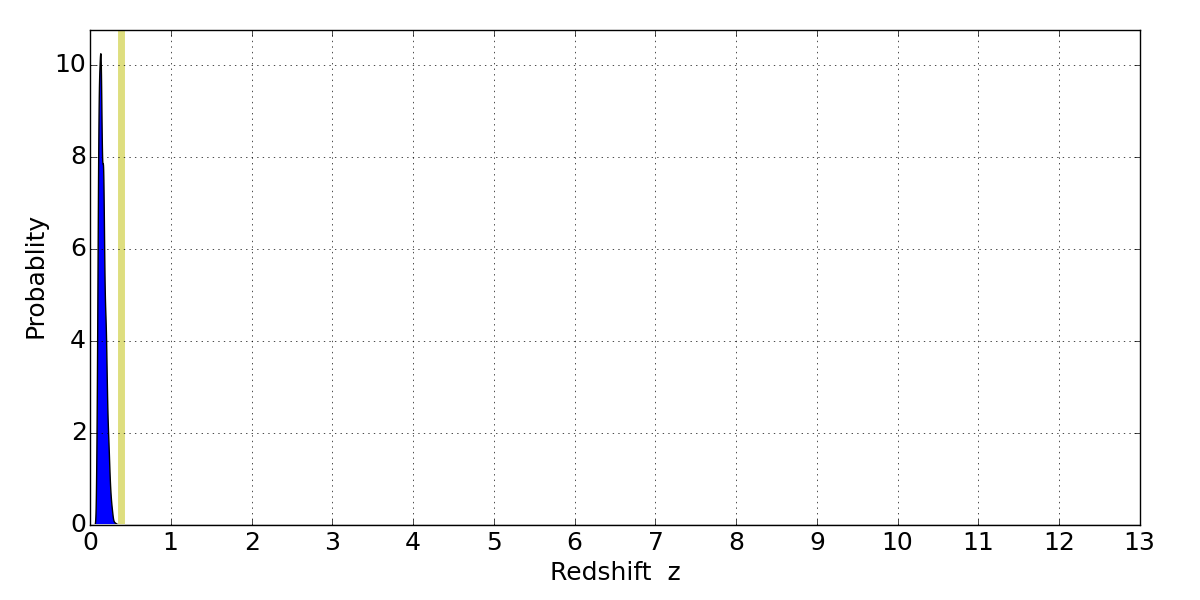 In P(z) plots: Yellow lines mark the cluster redshift z = 0.383,