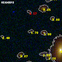 Object #96 x,y = (2121, 3284) RA, Dec = (09:49:52.680, 17:08:02.40) = (147.46950, 17.13400) BPZ = 1.785 [1.412--2.602] type = 9.40 (SB2_B10 - SB3_B10) chisq2 = 0.54 ODDS = 0.37 z_cluster = 0.383