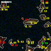 Object #989 x,y = (3242, 1508) RA, Dec = (09:49:48.000, 17:06:15.84) = (147.45000, 17.10440) BPZ = 0.771 [0.195--4.658] type = 9.00 (SB2_B10) chisq2 = 0.39 ODDS = 0.23 z_cluster = 0.383