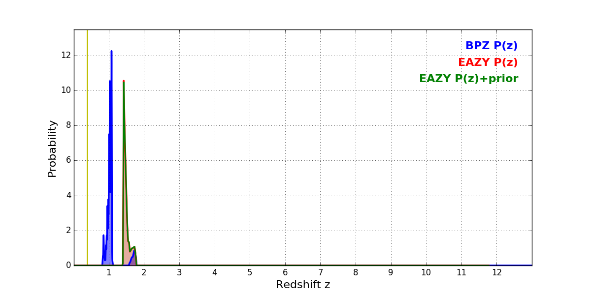 In P(z) plots: Yellow lines mark the cluster redshift z = 0.383,