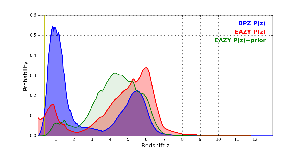 In P(z) plots: Yellow lines mark the cluster redshift z = 0.383,
