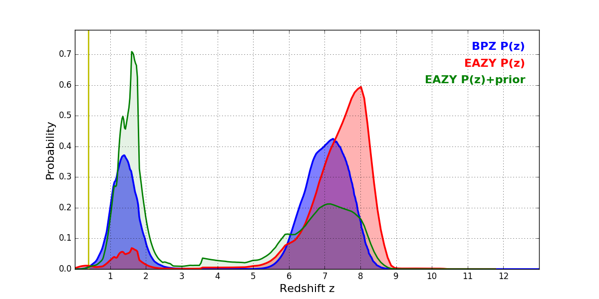 In P(z) plots: Yellow lines mark the cluster redshift z = 0.383,
