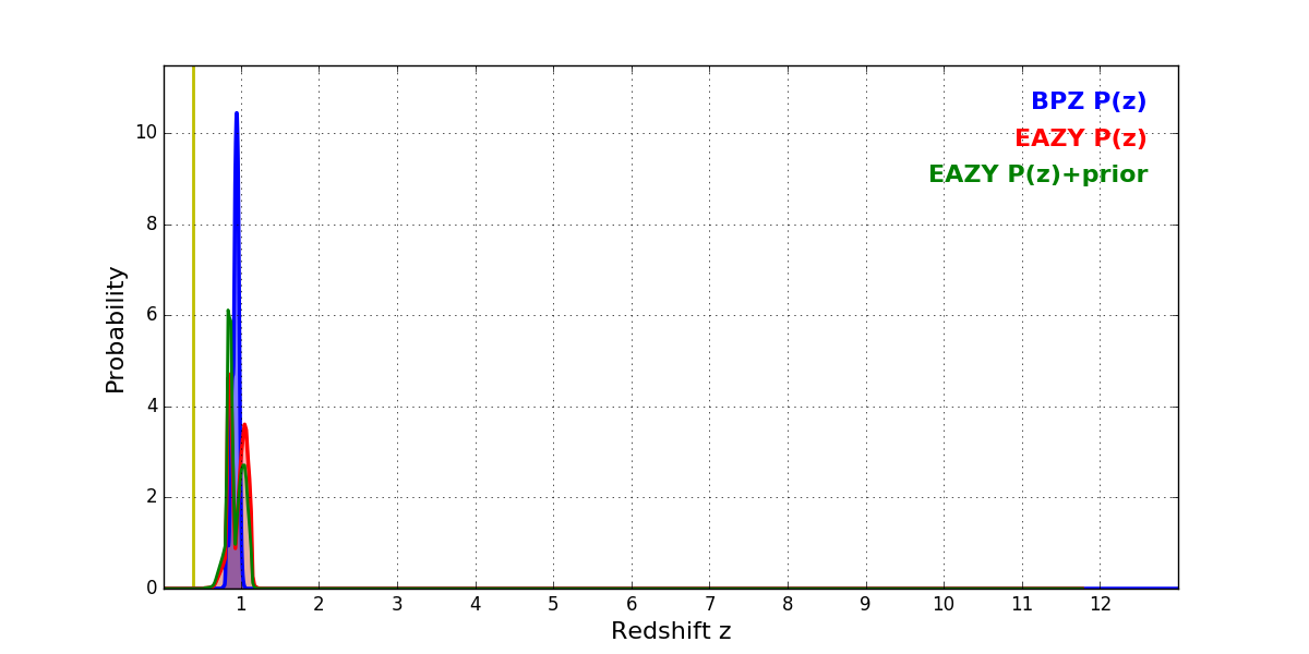In P(z) plots: Yellow lines mark the cluster redshift z = 0.383,