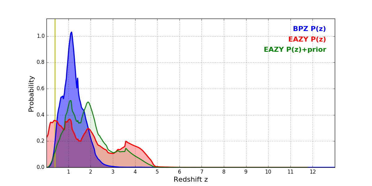 In P(z) plots: Yellow lines mark the cluster redshift z = 0.383,