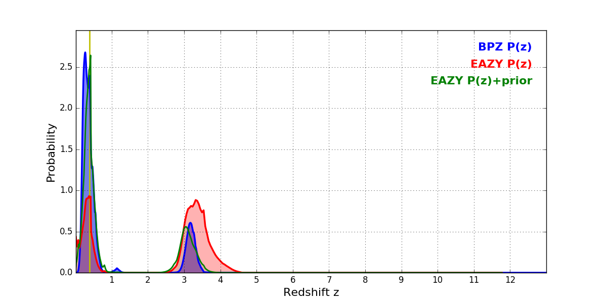 In P(z) plots: Yellow lines mark the cluster redshift z = 0.383,