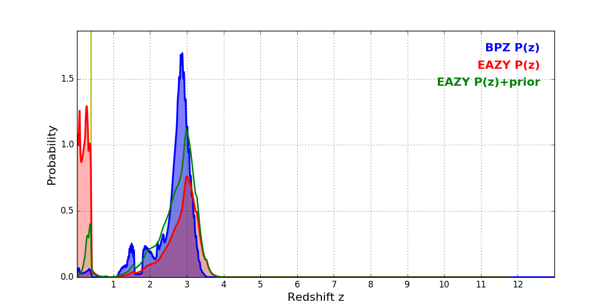 In P(z) plots: Yellow lines mark the cluster redshift z = 0.383,