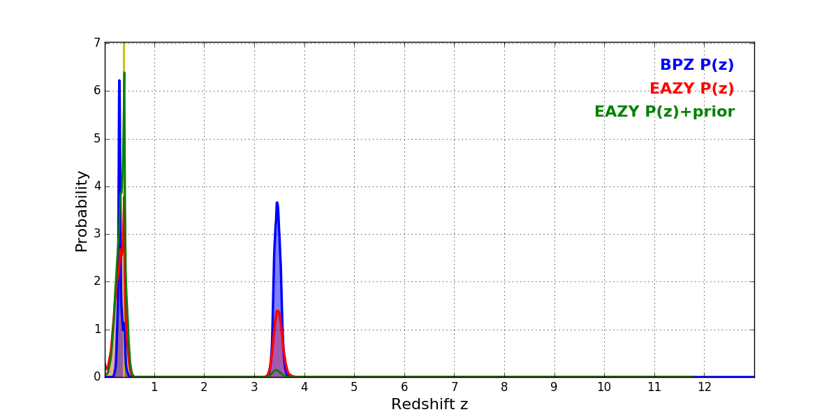 In P(z) plots: Yellow lines mark the cluster redshift z = 0.383,