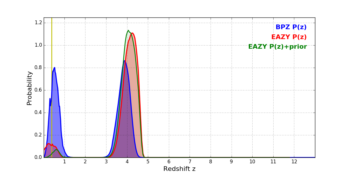 In P(z) plots: Yellow lines mark the cluster redshift z = 0.383,