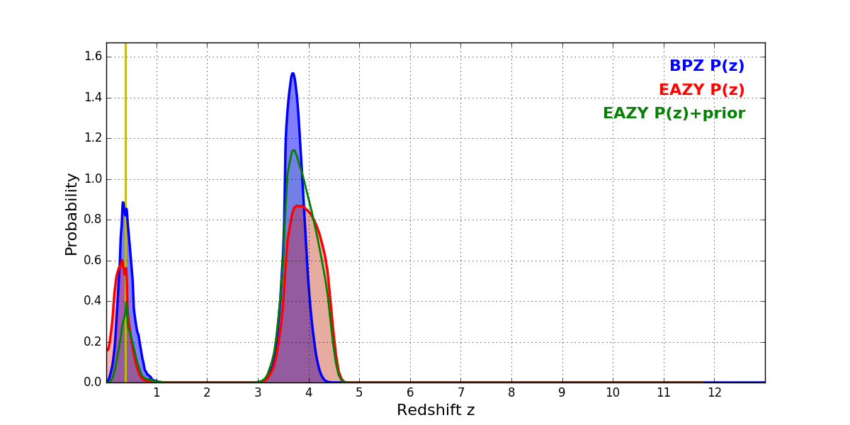 In P(z) plots: Yellow lines mark the cluster redshift z = 0.383,