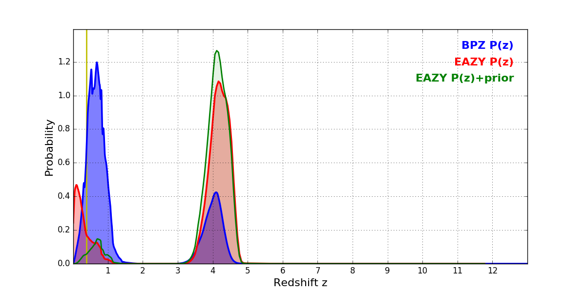In P(z) plots: Yellow lines mark the cluster redshift z = 0.383,
