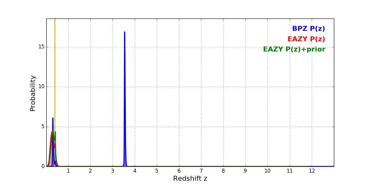 In P(z) plots: Yellow lines mark the cluster redshift z = 0.383,
