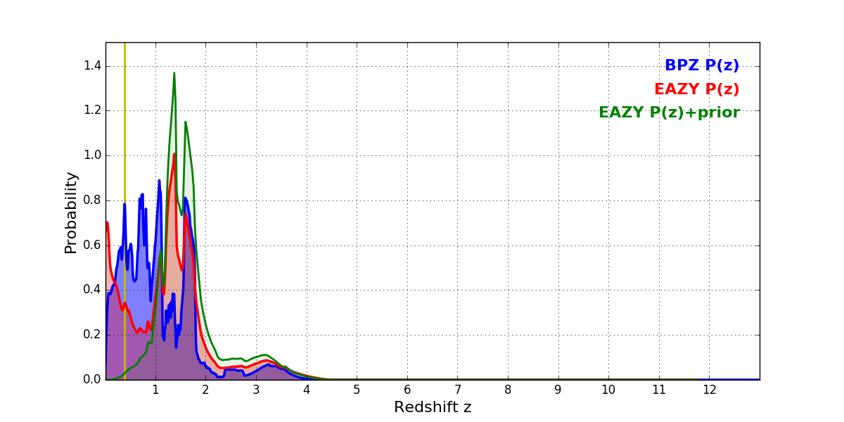 In P(z) plots: Yellow lines mark the cluster redshift z = 0.383,