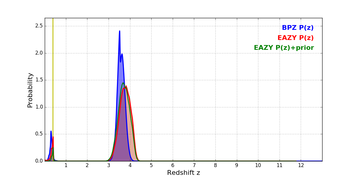 In P(z) plots: Yellow lines mark the cluster redshift z = 0.383,