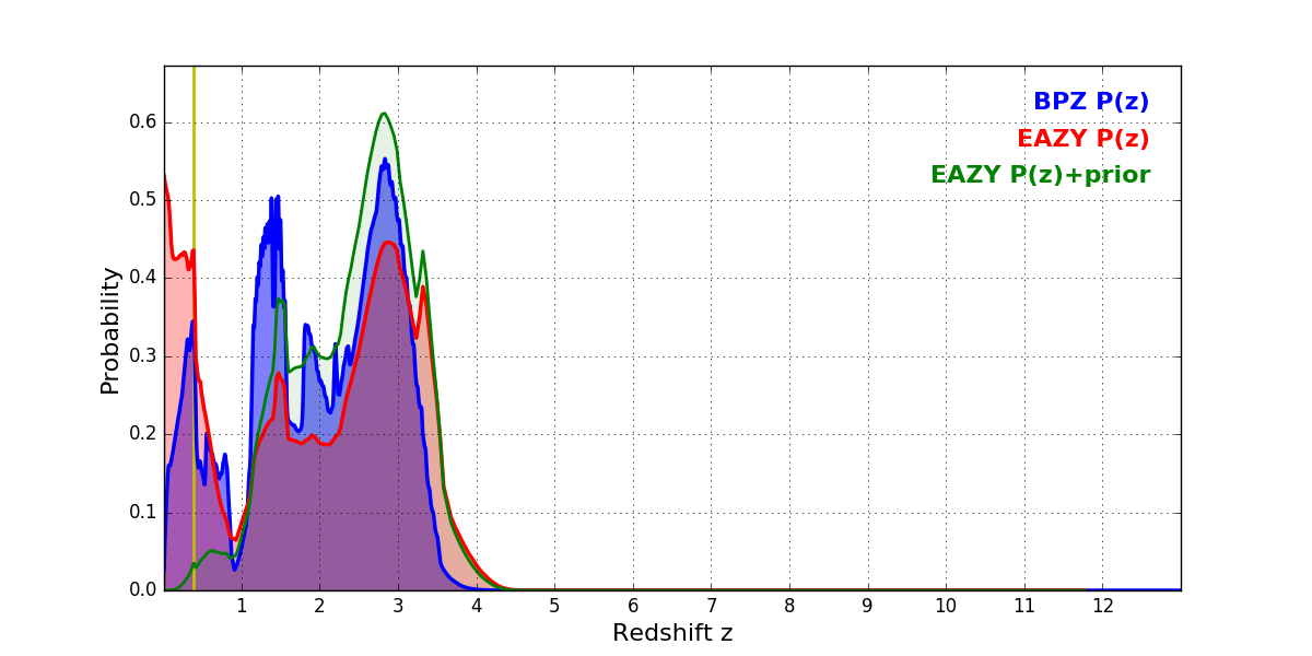 In P(z) plots: Yellow lines mark the cluster redshift z = 0.383,