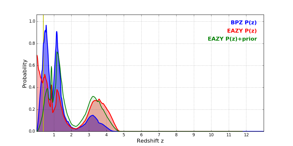 In P(z) plots: Yellow lines mark the cluster redshift z = 0.383,