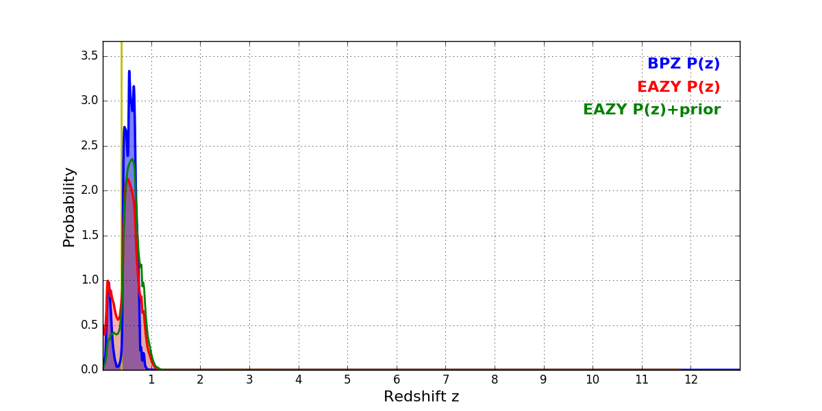 In P(z) plots: Yellow lines mark the cluster redshift z = 0.383,