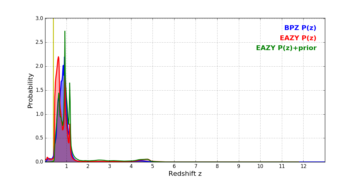 In P(z) plots: Yellow lines mark the cluster redshift z = 0.383,