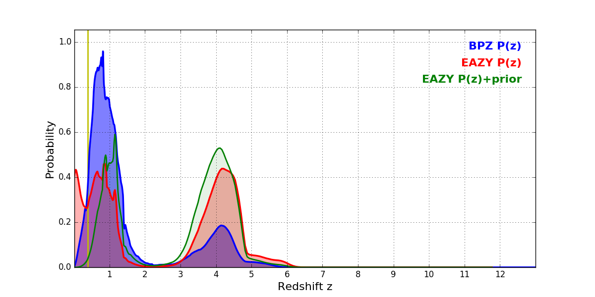 In P(z) plots: Yellow lines mark the cluster redshift z = 0.383,