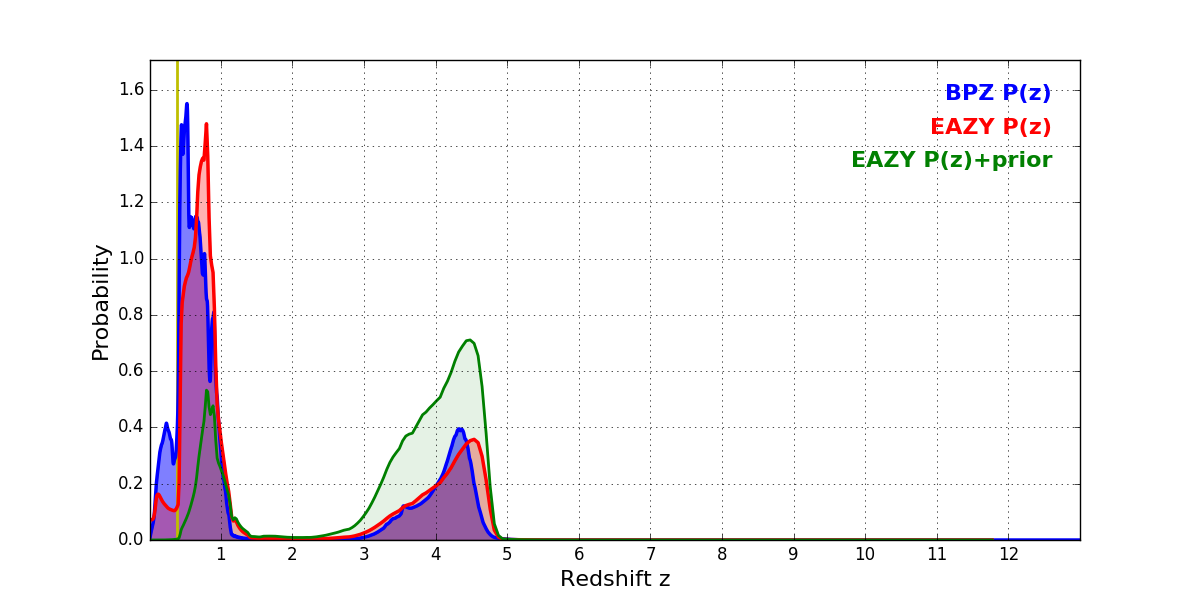 In P(z) plots: Yellow lines mark the cluster redshift z = 0.383,